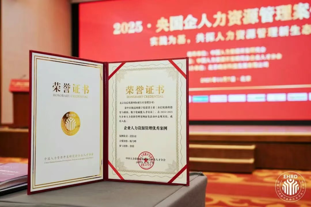近日,由中国人力资源开发研究会企业人才分会举办的“央国企人力资源管理案例论坛”在京隆重召开。论坛聚焦我国企业人才资源管理领域的创新实践与优秀成果,正式发布了2024-2025年企业人力资源管理优秀案例。众信旅游集团旗下零售品牌众信优游凭借《众信优游的思变与创新,数字化赋能人才培养》案例成功入选,并成为全场唯一获此殊荣的旅游企业。