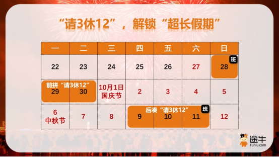 今年国庆、中秋再度“双节合体”,带来8天长假。另外,无论是“前拼”还是“后凑”,都只需要请上3天假,就能轻松解锁12天的“超长”假期。