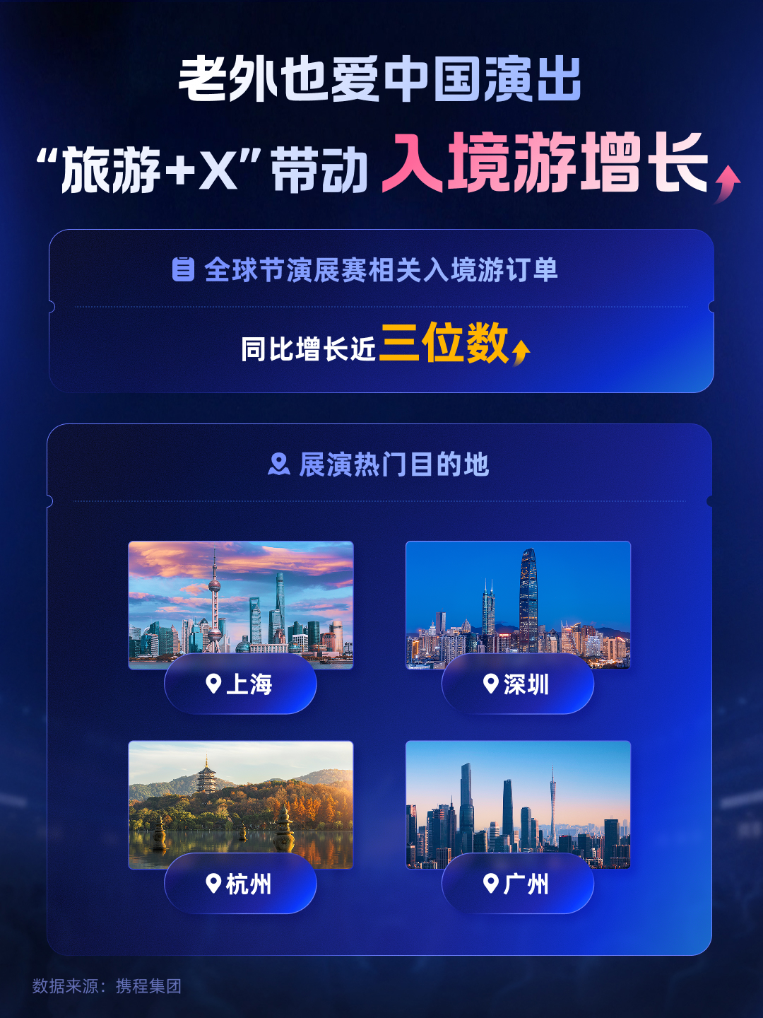 2025年,更多城市选择通过与超级文化IP深度结合,一场重磅演出或赛事,就像打在城市之上的一束“追光灯”。这束光让目的地瞬间成为全国乃至全球瞩目的“舞台中心”,吸引庞大客流。其价值不仅在于短暂的“高光时刻”,更在于借此机会全方位展示城市的魅力,将瞬间的关注转化为长期的品牌资产和“旅游留量”,照亮后续发展。报告显示,携程全球节演展赛项目为合作目的地城市带来新增游客量与旅游收入双丰收,全球节演展赛相关的入境游订单同比去年呈现近三位数增长。
