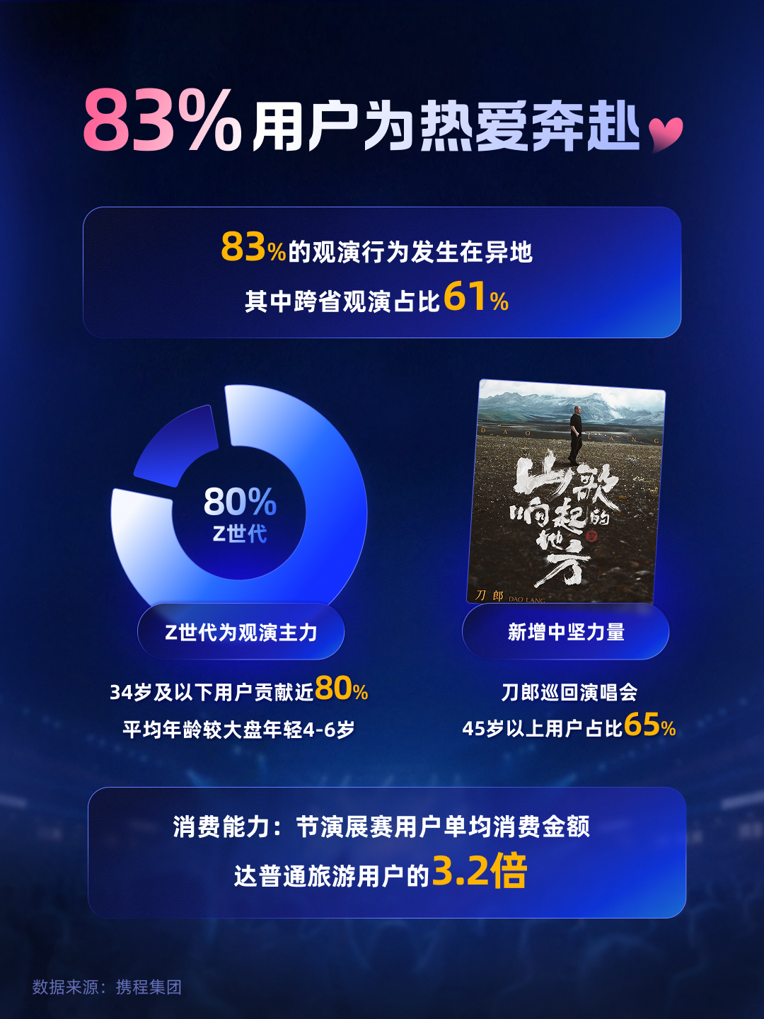 旅行与观演的边界正在消融,一场演出、一次赛事本身即构成了强有力的出行理由。携程数据显示,83%的观演行为发生在异地,其中跨省观演占比高达61%,“为体验而动”的旅游趋势已高度规模化。这标志着用户决策逻辑的根本性转变:从传统的“旅行中顺便看场演出”,彻底转向“为了一场演出而策划一次旅行”。