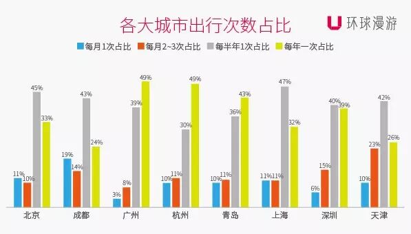 数据显示,41.06%游客每半年出境1次,36.86%的游客每一年出境1次,12.51%的游客每月出境2~3次,9.57%的游客每月出境1次。其中,成都游客出境频率最高,在每月1次及每月2~3次中占比为其他城市的2倍左右,休闲慢城的生活标签表露无遗。