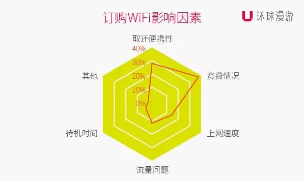 Wi-Fi已成为出境游必备物品,目前市面上出境Wi-Fi种类繁多,但究竟哪些因素会成为用户订购Wi-Fi重点考虑的方面?通过调查,环球漫游发现在订购Wi-Fi产品前,有37%的用户最先考虑的是资费情况,有28%的用户首要考虑机器取还是否方便,15%的人群更在意上网速度是否顺畅,12%用户更关注流量额度问题,另有5%的群体重视机器的待机时间。