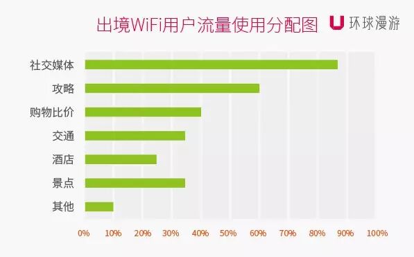 在Wi-Fi使用方面,《报告》显示,游客平均使用流量为463.54MB,和2014年同期相比增加40%,预计2016年人均使用流量将超过700MB。其中上网浏览社交媒体占比87%,查询目的地攻略占比60%,对比购物价格占比40%,用车、查找路线、查询票务信息占比34%,查询酒店信息占比25%,查看景点、生活信息占比34%,工作、在线游戏等其他项目占比10%。