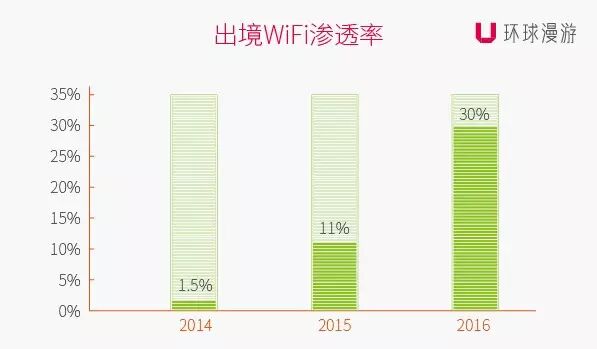 从环球漫游出境Wi-Fi大数据报告上看,2014年每100个出境旅客中有1.5个左右使用Wi-Fi产品,在2015年互联网+旅游蓬勃发展的背景下,Wi-Fi市场渗透率从2014年的1%-2%,一跃上升到10%左右。随着用户普及度的增加,环球漫游认为到2016年,出境Wi-Fi市场渗透率将达到30%。