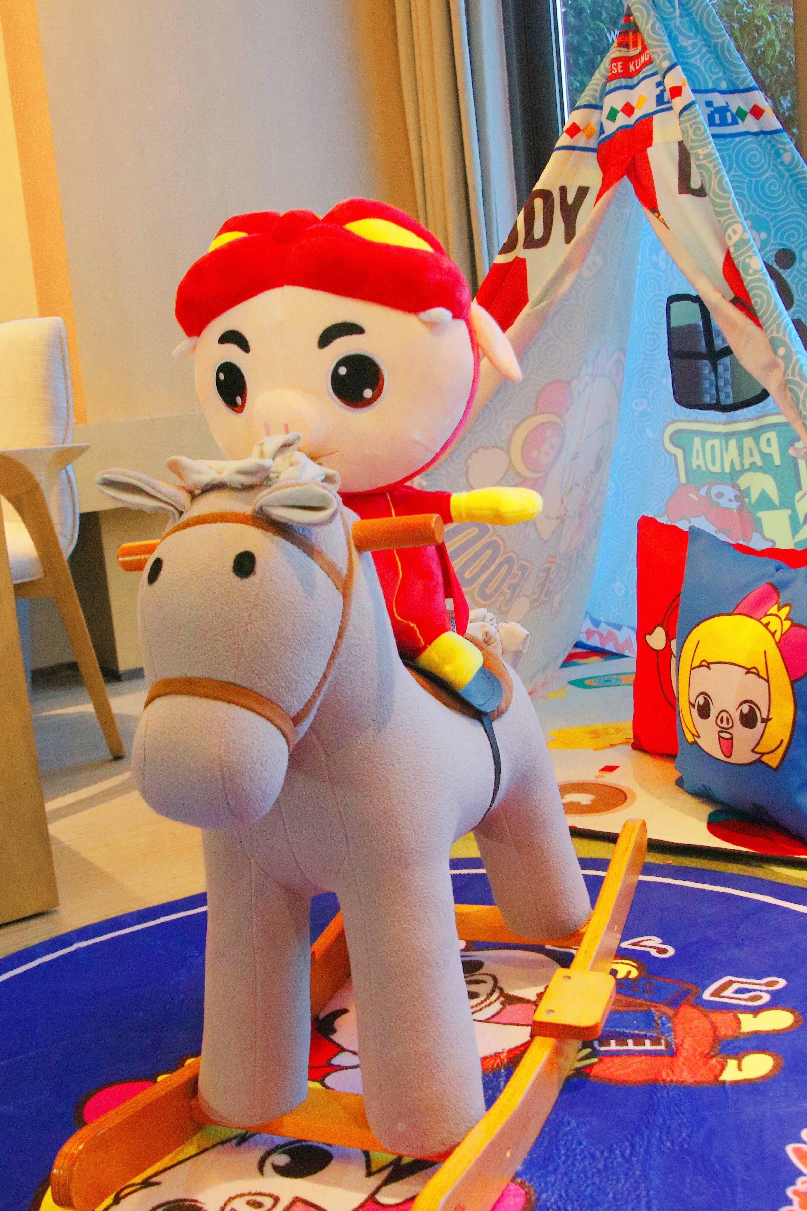 酒店的儿童泳池房经过精心改造,房间以蓝黄色系为基调,从床旗、抱枕、木马、儿童帐篷、猪猪侠公仔、拼图、玩具、书包、漫画书、浴袍,甚至到毛巾、拖鞋、儿童洗手液、漱口杯、墙贴、防撞贴条、衣架等等,都充满猪猪侠的主题元素,旨在为萌娃创造一个猪猪侠的童趣世界。