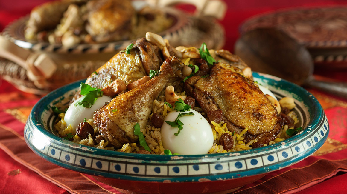Kabsa,源自阿拉伯语“ kbs”,意为 “压扁”,Kabsa的特点是将一锅中的原料一起压扁(煮熟)的菜肴。作为沙特阿拉伯的国菜,Kabsa是当地午餐最受欢迎的菜式。它可以用各式各样的食材来制作,其中三种最主要材料是大米、蔬菜和肉类。在沙特阿拉伯,这道菜的肉食可以用牛肉、山羊肉、羊肉、鸡肉,甚至是骆驼都可以完美重现这道佳肴的美味。丁香、肉桂、藏红花、豆蔻、月桂叶、黑胡椒、肉豆蔻和Loomi(晒干的黑柠檬)都是用来调味这道菜品的调料。