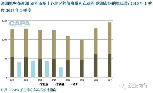 自2013年以来,澳洲航空已将投入到亚洲的座位量从东南亚转移至了东北亚。这是其缩小在东南亚的历史规模、同时在东北亚增长的结果。2017年1季度,澳洲航空在东南亚的座位量将比2012年1季度少23%。但同期其在东北亚的座位量却将比2011年1季度的峰值高出16%。