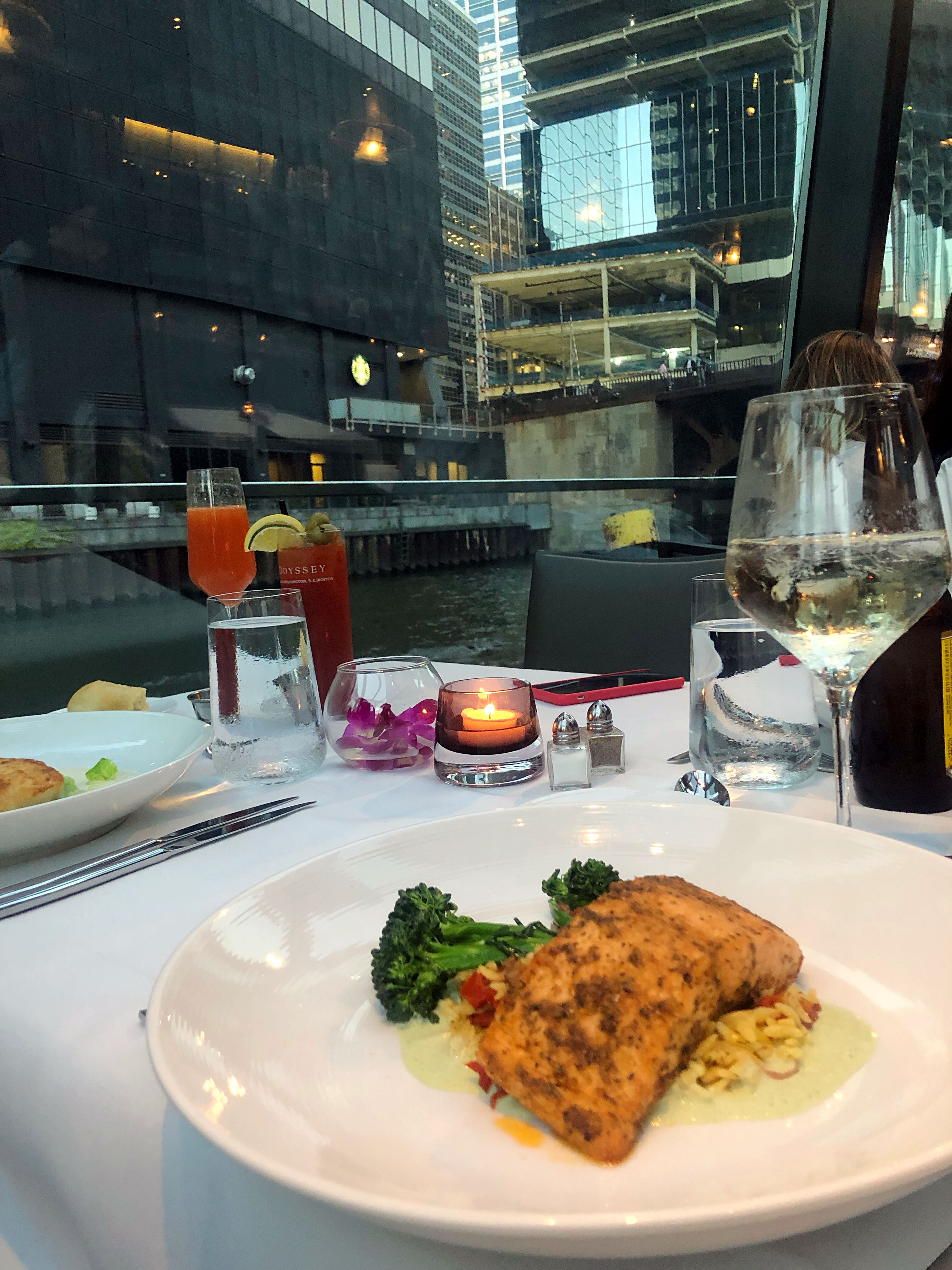 来到芝加哥旅游,至少要坐一次游船在芝加哥河或者是密歇根湖上一览芝加哥。因为,白天的建筑巡游还是夜晚的烟火邮轮,都会让你体验不一样的芝加哥风景。这次我们考察团乘坐的Odyssey游轮是刚刚建成下水的,船体设计简约时尚,当晚上船晚餐的客人即有热恋的情侣,也有结婚多年重温爱意的老夫妻,还有年轻活力无限的闺蜜团,我们不禁感叹,芝加哥湖的游轮的确适合各类人群。乘坐游轮前,船员会邀请游客和船体拍照留念,下船时即可领取照片,费用包含在晚餐中。