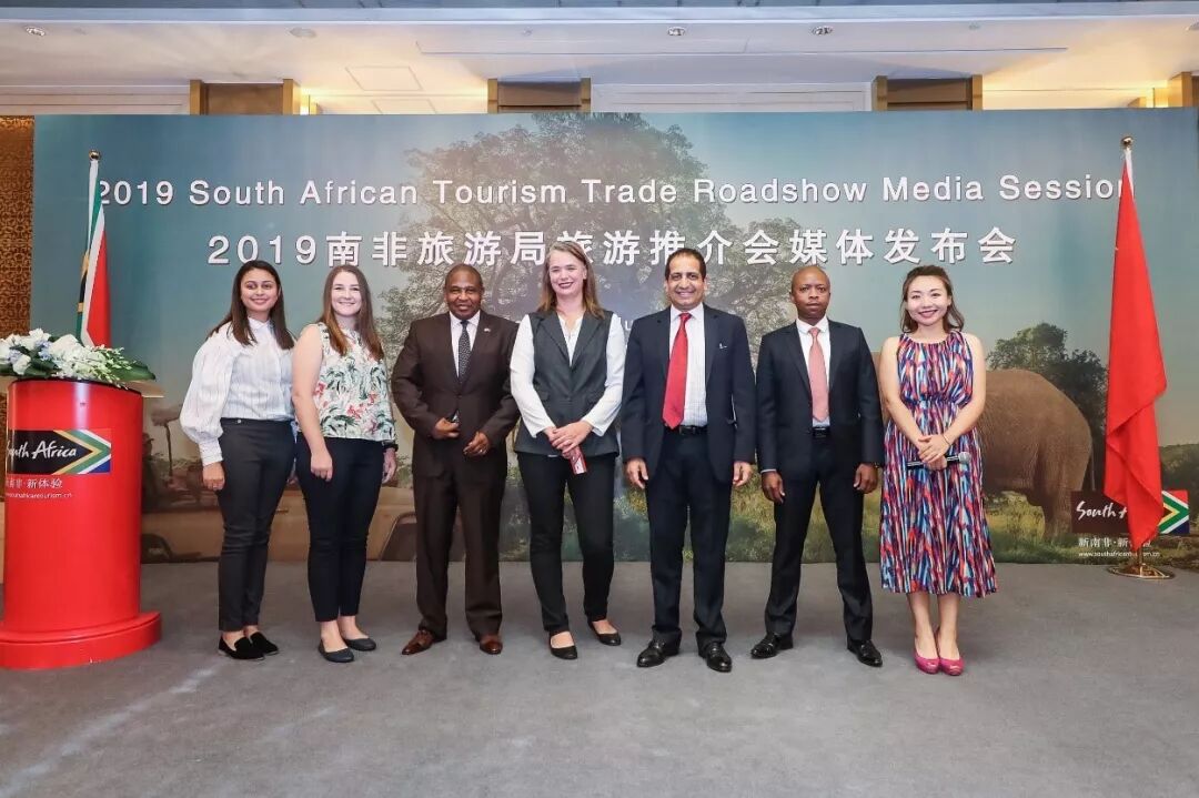 (本次参会嘉宾从左至右依次为:开普敦西开普新兴市场协调员Lana Carls女士、南非旅游局澳亚及中东区域产品专员Liesl de Wet女士、南非共和国驻华大使馆一等秘书(经济)SethS. Mompei先生、南非旅游局亚太及中东区域总经理HanneliSlabber女士、南非旅游局亚太区首席代表MansoorMohamed先生、南非共和国驻华大使馆一等秘书Simon Modiba先生、主持人苗珊女士)