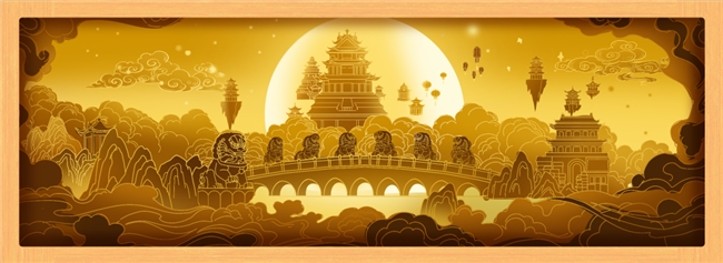 卢沟晓月纸雕灯:纸雕灯图案,灵感来自“卢沟晓月”灯组,曙光未露、明月映照下,卢沟桥的美景尽收眼底。行走在游园灯会中,打一盏纸雕灯,氛围感满满~