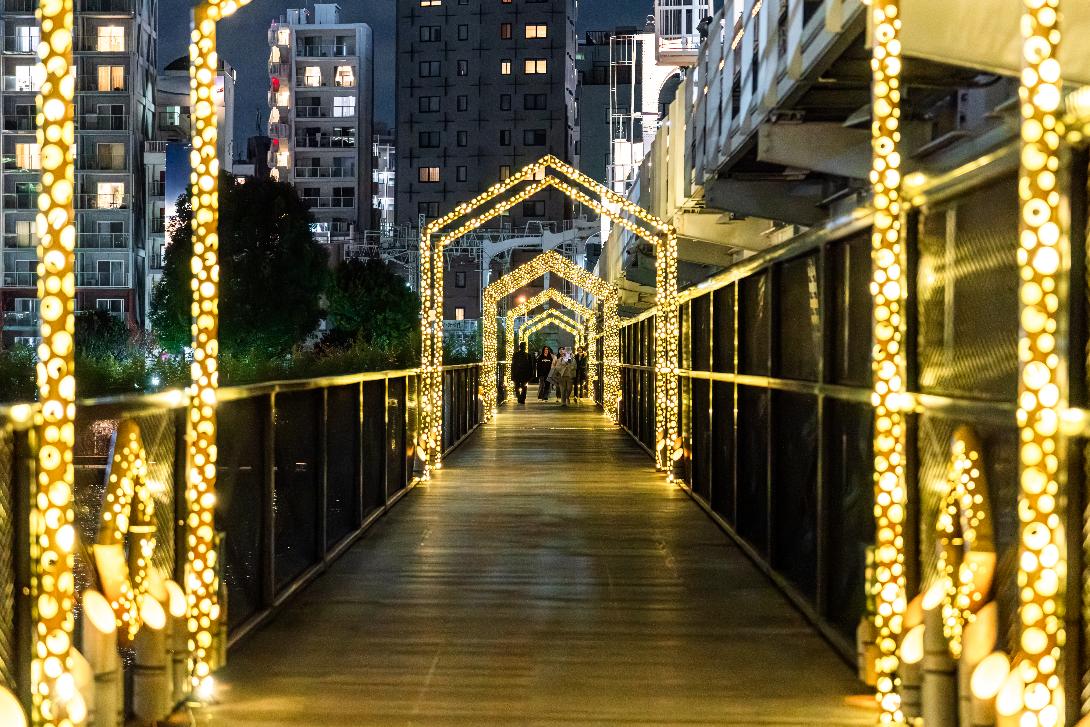 连接东京晴空塔城与浅草的步行桥“隅田川步道桥”上,将出现由竹灯构成的光之拱门。从桥上眺望,可欣赏以东京晴空塔为背景的美丽夜景。欢迎前来,发现属于东京冬夜的新魅力。