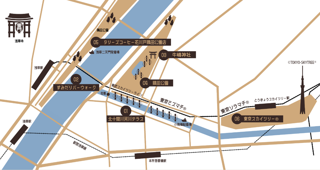 位于隅田川畔的 TULLY’S COFFEE 花川户隅田公园店,是一处可以以东京晴空塔为背景进行拍摄的人气打卡点。