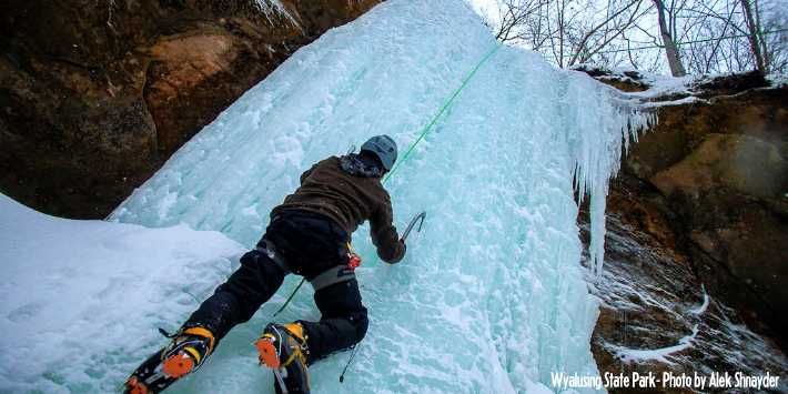 第一次听到攀冰岩时,脑海中疑窦丛生,这是一项被称为冬日里古怪消遣的项目,然而却吸引了大批成熟的攀岩爱好者在冬日挑战自己新的极限。威斯康星州普雷里德欣(Prairie duChien)以南的怀厄卢辛州立公园(Wyalusing State Park),道奇维尔(Dodgeville)以北的道奇州立公园(Governor Dodge State Park),沿着威斯康星河靠近隆罗克(Lone Rock)的区域,以及其他一些中西部地区的位置,都是攀冰岩项目的绝好体验地。