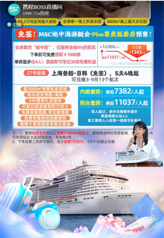 2024年进入3月以来,春回大地,伴随春意一同回归复苏的,还有国内的邮轮市场。春节以来,目前已有多艘国际邮轮宣布将回归中国母港运营,中国邮轮市场开始进入加速复苏阶段。2024年3月16日,中国上海,全球最大家族邮轮企业MSC地中海邮轮旗下“亚洲旗舰”MSC荣耀号(MSC Bellissima)即将迎来中国大陆地区的首航,率先成为疫后首个从中国大陆母港启航的国际邮轮品牌。3月13日MSC地中海邮轮中国区总裁黄瑞玲做客携程Boss直播间,为直播间用户带来荣耀号丰富好货,并为间用户送上免舱等大额福利,数据显示,直播当日,直播间热度超1499万,点赞超112万,而荣耀号日历产品订单环比大涨146%,其中“游艇会”系列的高端产品订单销售环比增长281%,充分展示了携程用户对邮轮高端产品的巨大消费力。