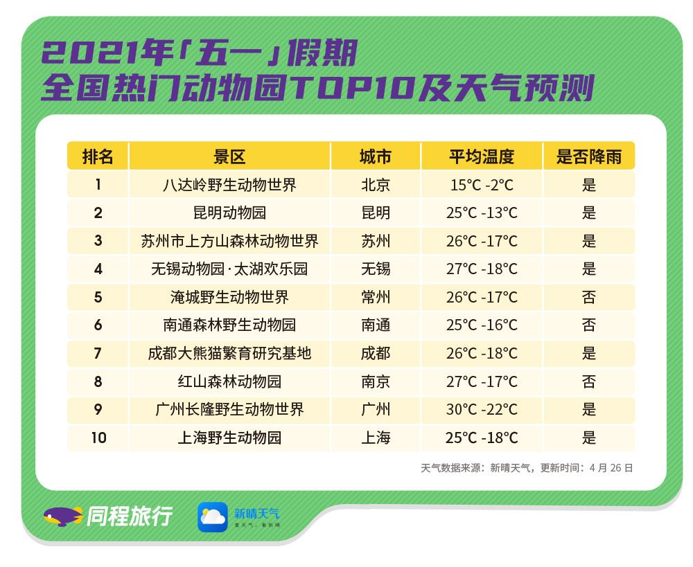 同程旅行门票预订数据显示,八达岭野生动物世界预计将是“五一”期间最热门的动物园,此外,昆明动物园、苏州上方山森林动物世界、无锡动物园·太湖欢乐园、常州淹城野生动物世界、南通森林野生动物园等线上预订情况也非常火爆。
