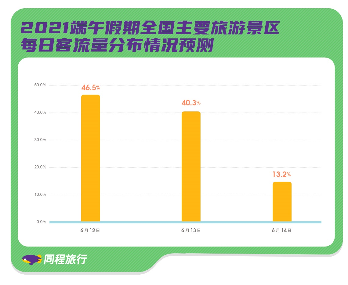端午假期期间,丰富多彩的文旅活动和多种多样的各类文旅产品是居民家庭周边游的“主菜”。《报告》来自同程旅行的景点预订数据显示,预计端午假期首日全国各地旅游景区将迎来客流高峰,假期前两天主要景区的客流量预计将占整个假期客流总量的86%以上。