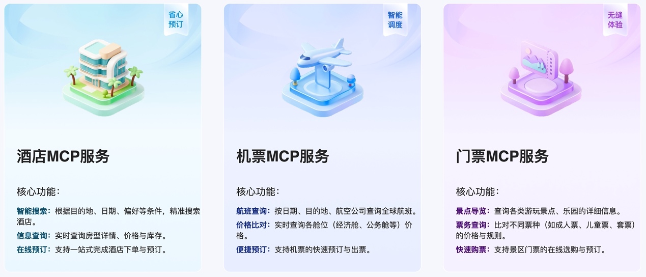 门票MCP服务可根据用户的查询各类游玩景点、乐园的详细信息,比对不同票种(如成人票、儿童票、套票)的价格与规则,并支持景区门票的在线选购与预订。